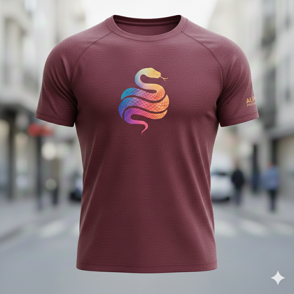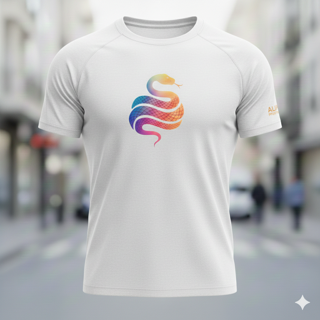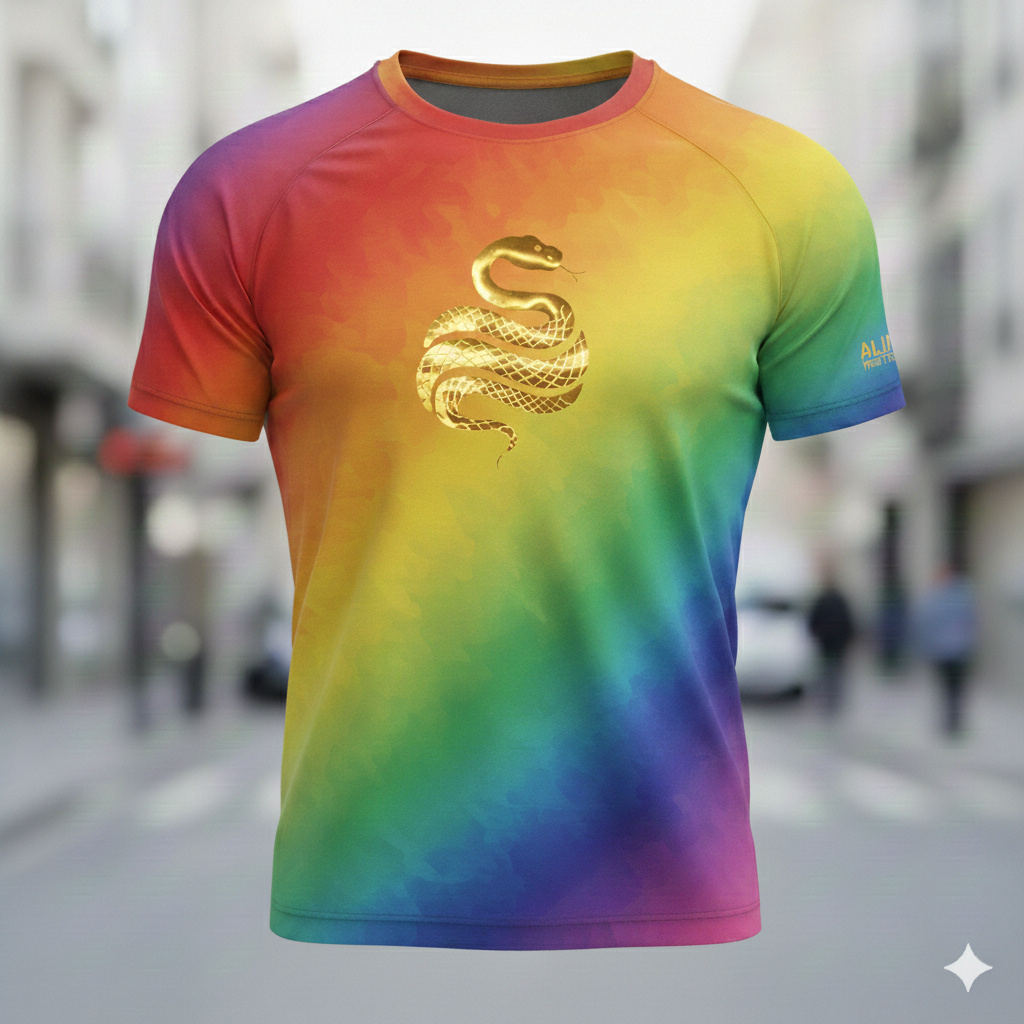 Gráfico Signature «Rainbow Snake»: Presenta el icónico logotipo de la serpiente Alupa en el pecho con un degradado multicolor que simboliza dinamismo y energía.