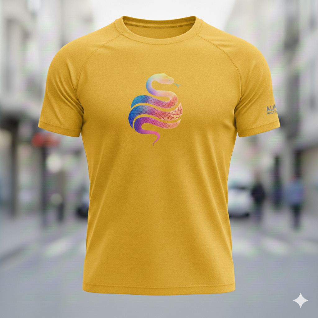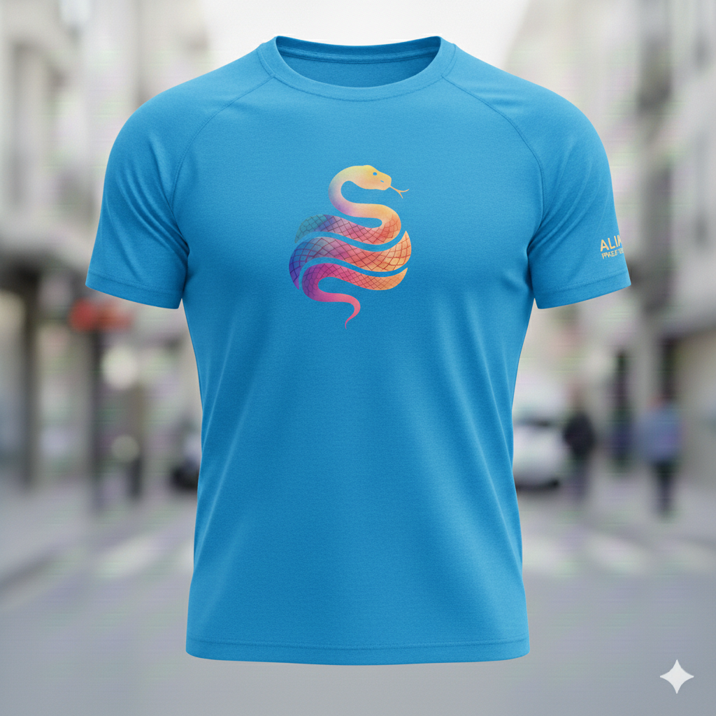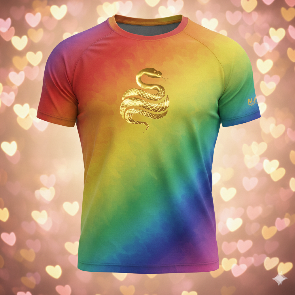Gráfico Signature «Rainbow Snake»: Presenta el icónico logotipo de la serpiente Alupa en el pecho con un degradado multicolor que simboliza dinamismo y energía.